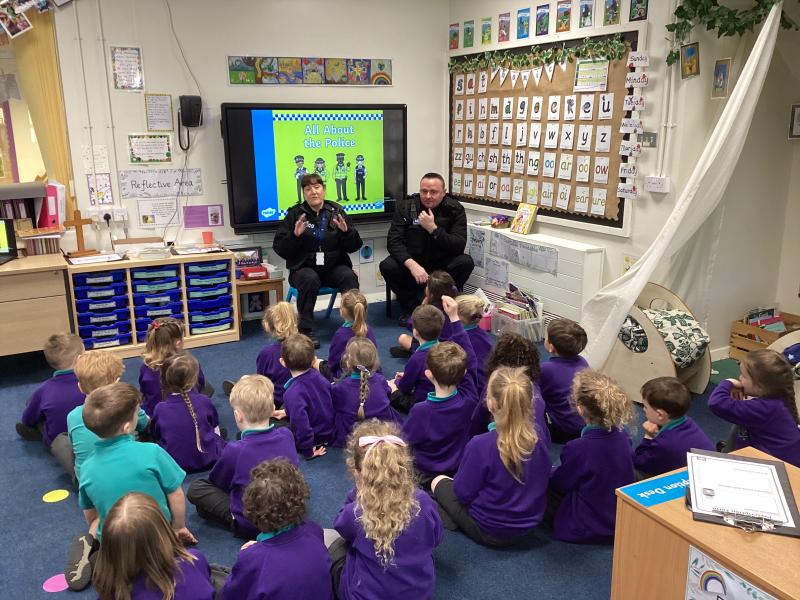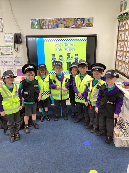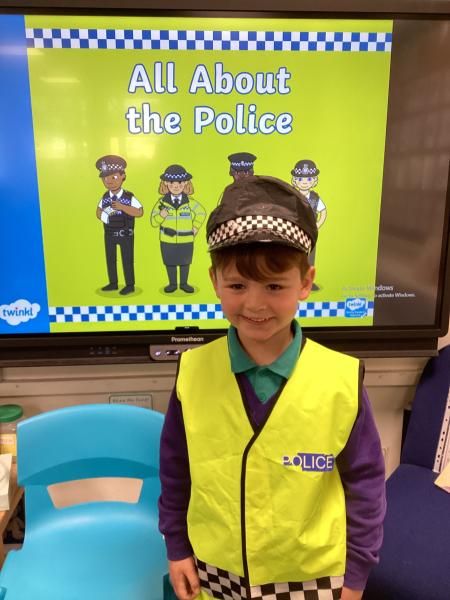 As part of our ‘People Who Help Us’ topic, we had a visit from the police this week. We enjoyed listening to PC Julie and PC Scott telling us all about their role. We then asked the questions that we had gathered as a class to find out even more about their important work. Finally, we loved dressing up in their police uniform and even getting a chance to sit in their police car!