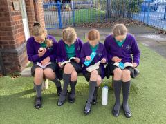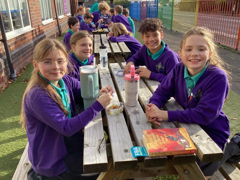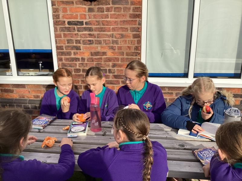 Y6 made the most of a bit of downtime outside on the picnic benches today. They enjoyed their fruit snacks in the sunshine whilst reading and chatting with their friends.
