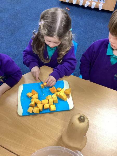 With the weather getting colder this week, Reception have been busy making a butternut squash soup. We loved learning all about the different ingredients and discovering how some of them grow. We then worked together to chop the spring onions and the butternut squash as a team. We also added the other ingredients that we needed from the recipe we followed. Finally, we sat down together to enjoy our tasty soup. Well done Reception Class!